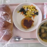 今日の給食は、 黒パン、牛乳、押麦入り野菜スープ、かぼちゃコロッケ、はるさめサラダ です。 久しぶりに黒パンが登場しました。黒パンは、黒砂糖の甘みがきいていておいしいです。