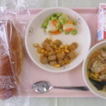今日の給食は、 ツイストパン、牛乳、キャベツと肉団子のスープ、クリスピーチキン、花野菜のサラダ です。 クリスピーチキンは衣がサクサクで生徒に人気の献立です。今日もおかわりじゃんけんの声がよく聞こえ …