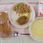 今日の給食は、 ドライカレー、牛乳、オニオンスープ、ミートかぼちゃフライ、花野菜サラダです。 今日から2学期の給食が始まりました。子どもたちも元気で何よりです!! 夏休みの間に、調理員さんたちによ …