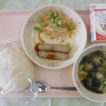 塩ラーメン、牛乳、春巻、花野菜サラダ、ブルーベリーゼリーです。 自校中のめんは個包装のめんではなく、大袋で納品されるのでそれを給食室で蒸しなおして、くっつかないように油を少し和えてから配缶しています。 …