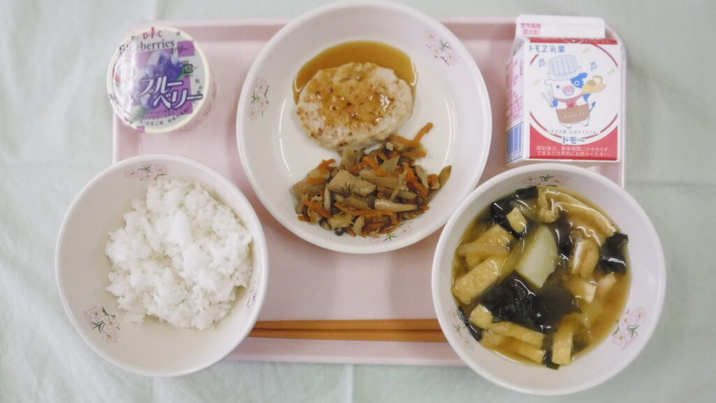 秋の香りごはん、牛乳、じゃがいもとわかめのみそ汁、あんかけ豆腐ハンバーグ、ブルーベリーゼリーです。