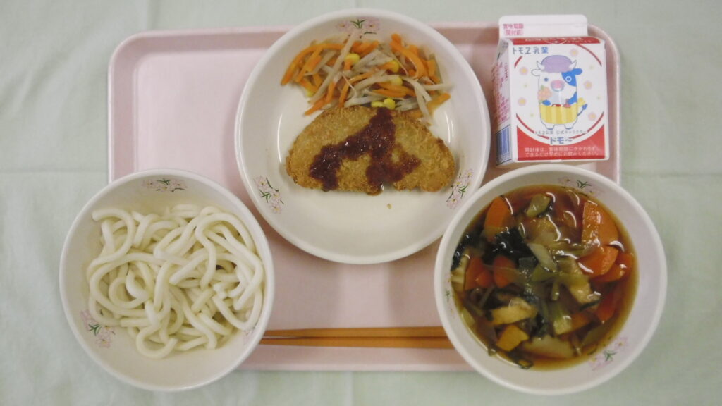 ねぎまうどん、牛乳、さけフライ、ごぼうサラダです。