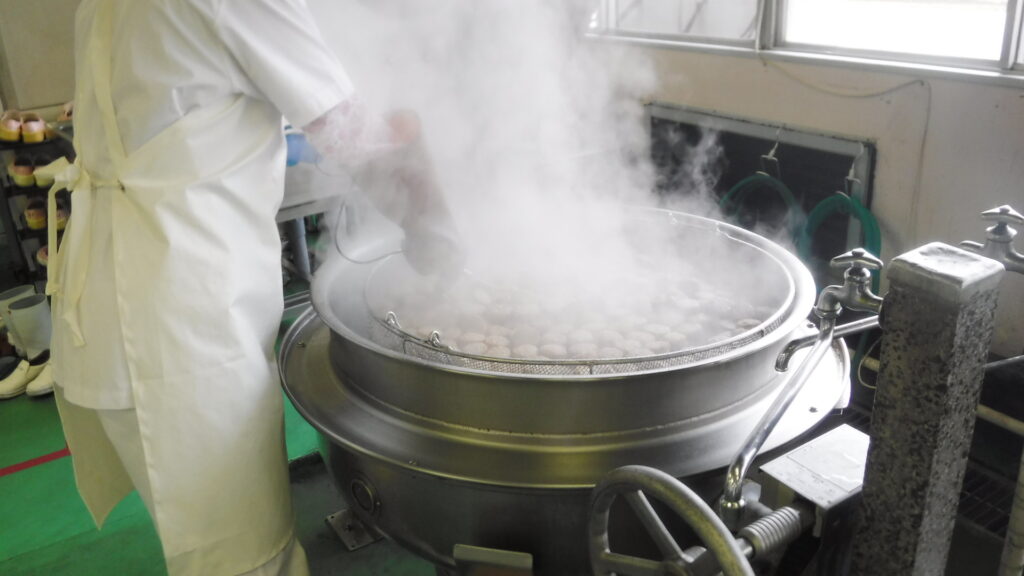 白ごまつくねは1人3個なので1500個以上を蒸して、数えての配缶です、、。白ごまつくは甘辛いたれとよく合います。