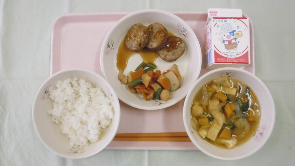 ごはん、牛乳、かぼちゃのみそ汁、白ごまつくね、さといものうま煮です。