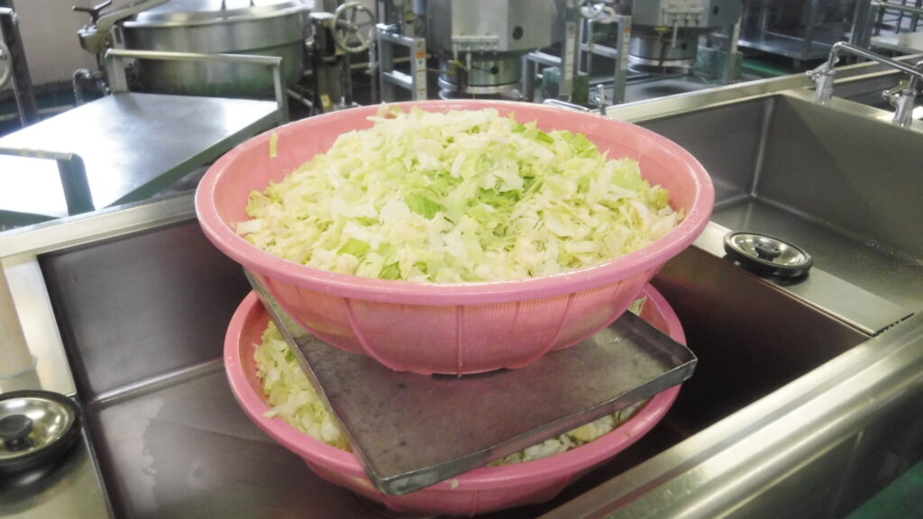 今日の給食は、 ごはん、牛乳、ごまキムチみそ汁、豚肉のにんにくソースがけ、海藻サラダです。 豚肉のにんにくソースがけは豚肩ロース肉の角切りにでんぷんをまぶして、油で揚げます。 揚げたお肉ににんにくソー …