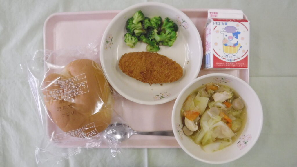 フラワーロール、牛乳、ポトフ、コーンフライ、ブロッコリーです。