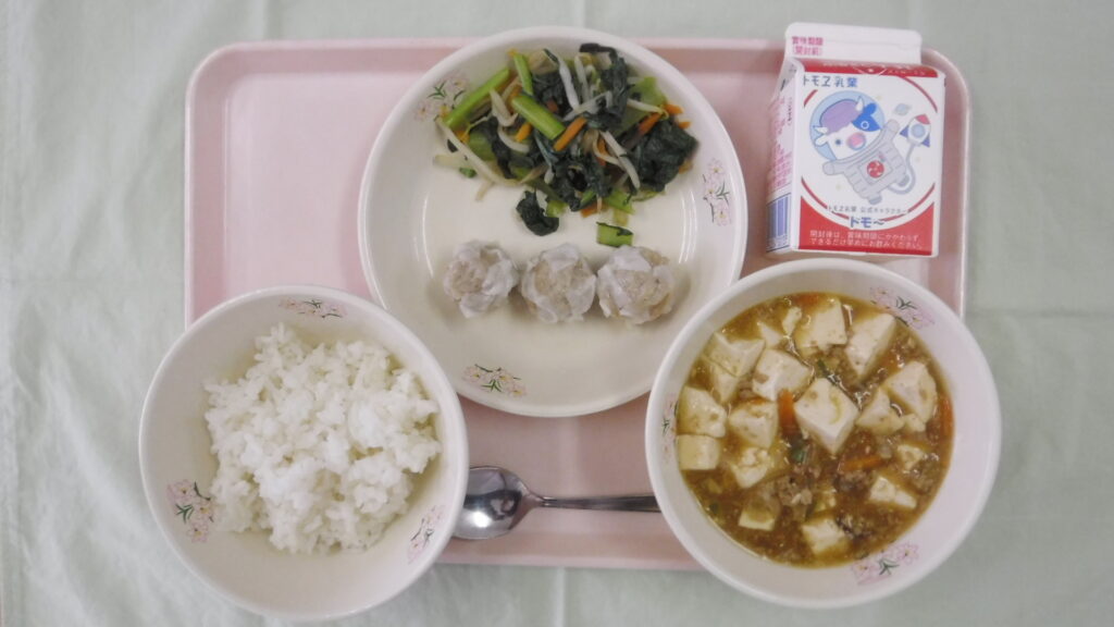 ごはん、牛乳、マーボー豆腐、しゅうまい、もやしと小松菜の炒め物です。