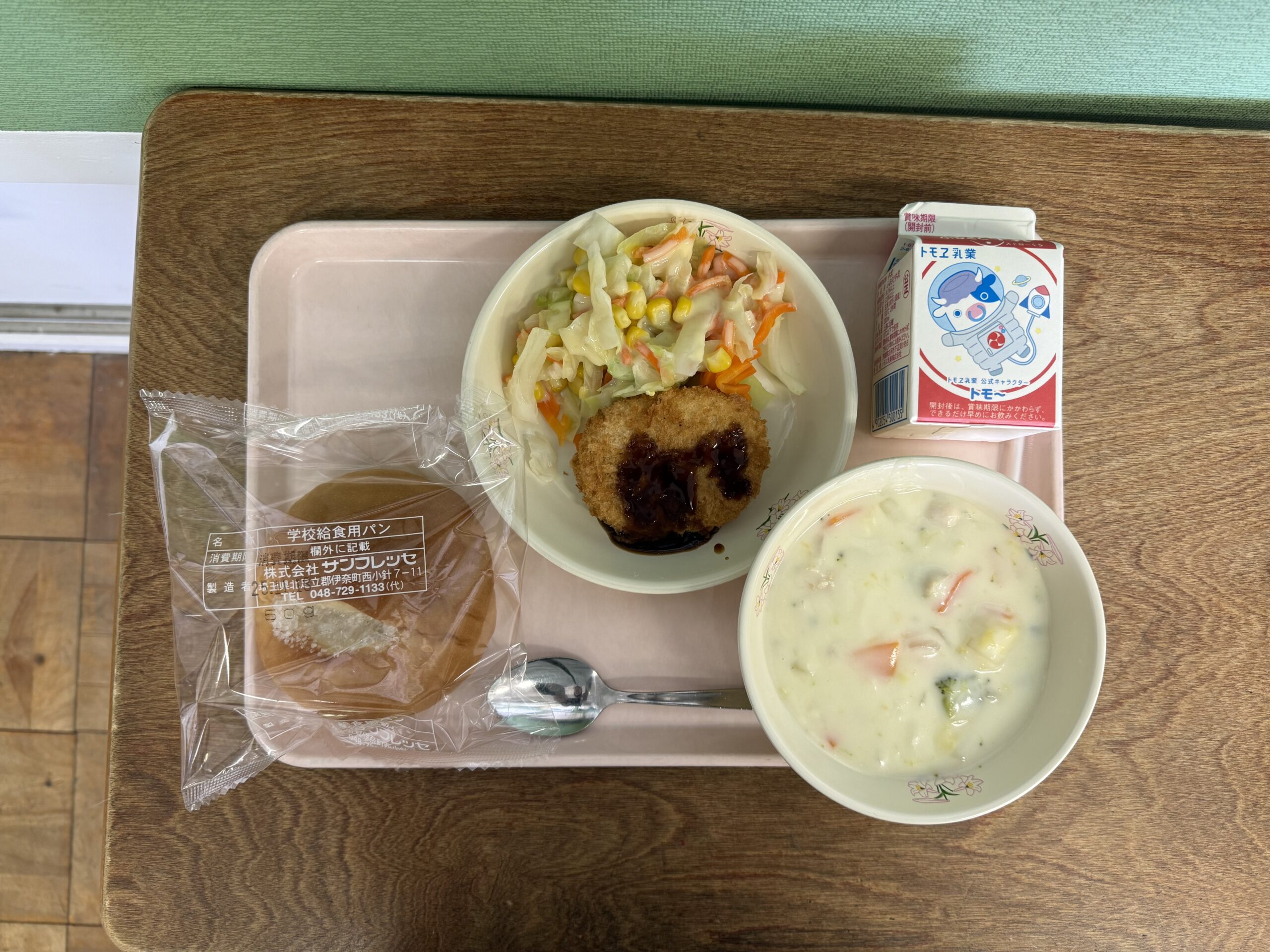 米粉入りシュガーパン、牛乳、むさしのシチュー、川口さといもコロッケ、コーンスローサラダです。