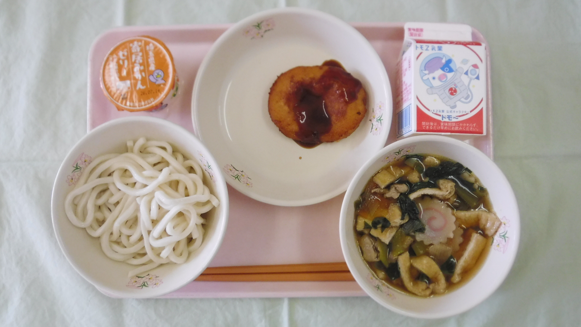ねぎまうどん、牛乳、ゼリーフライ、寄居町みかんゼリーです。