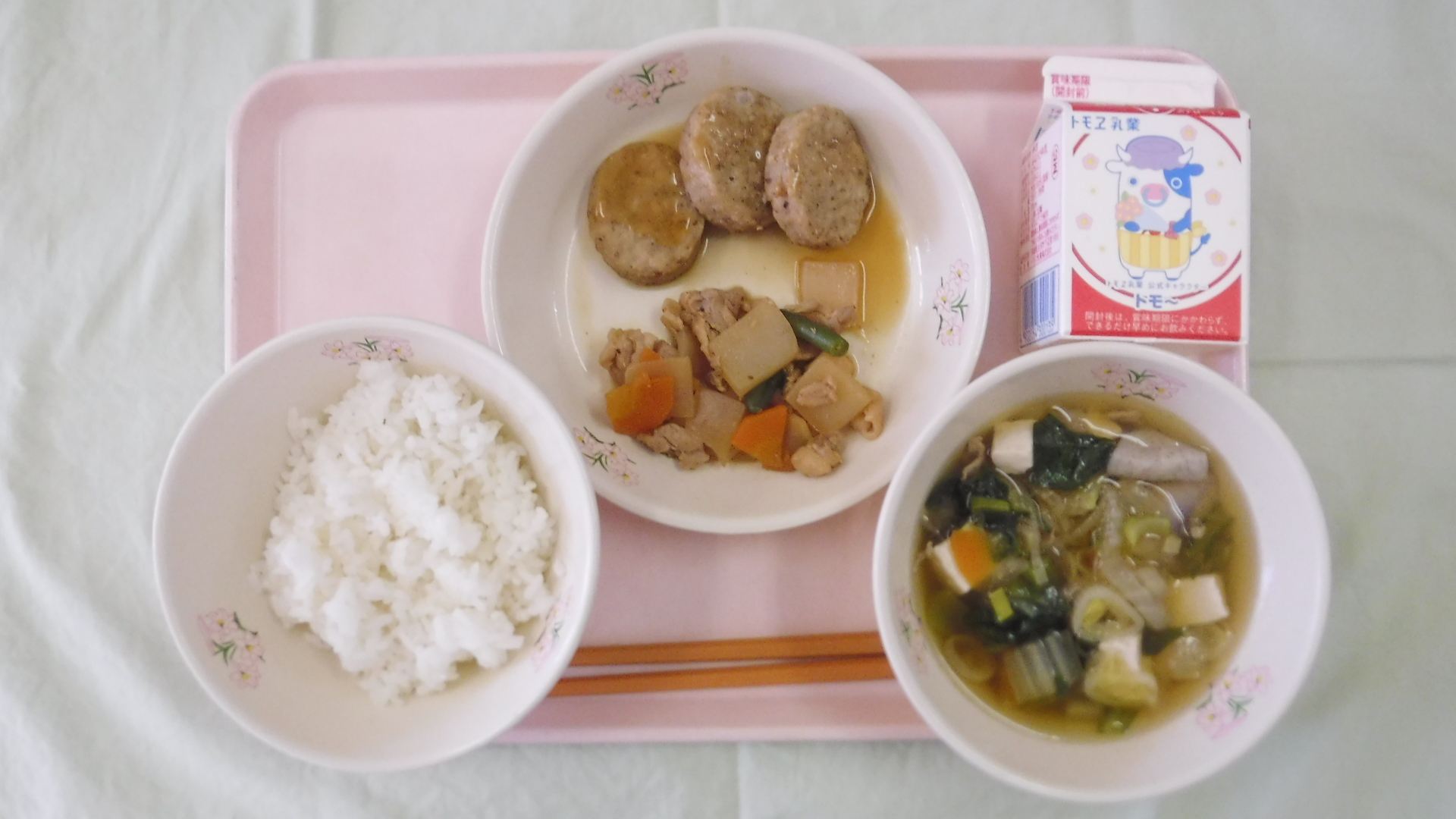 ごはん、牛乳、彩の国汁、白ごまつくね、こんにゃくの炒め煮です。