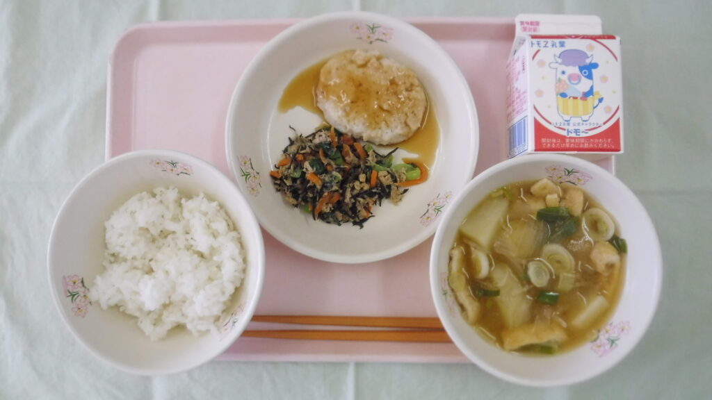 ごはん、牛乳、じゃがいものみそ汁、あんかけ豆腐ハンバーグ、ひじきツナ炒めです。