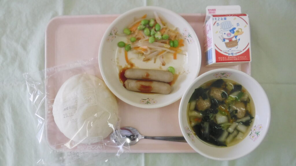 メロンパン、牛乳、はくさいと肉団子のスープ、ソーセージケチャップソース、枝豆のサラダです。