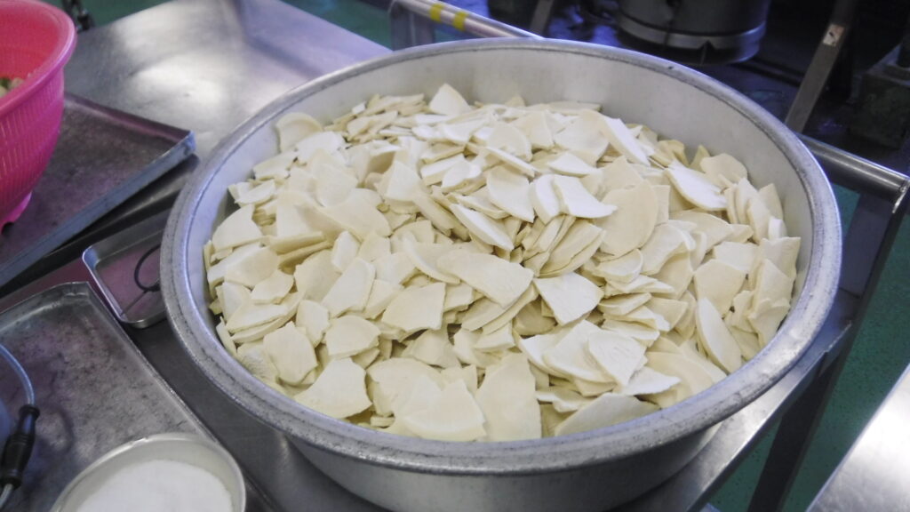 せんべいは茹で時間によって食感が変わってきます。里中のせんべい汁は、給食室で出来上がった時は少し堅めで、子どもたちが食べる時間になるまでに余熱でちょうどよくなるように仕上げています!