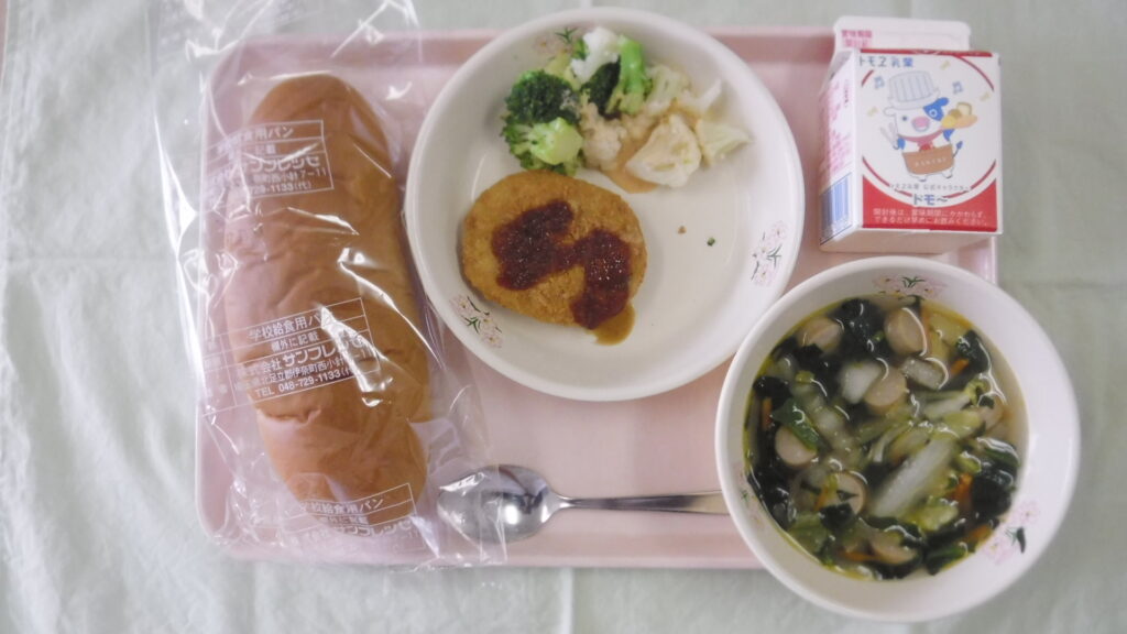 黒パン、牛乳、はくさいのスープ、ミートかぼちゃフライ、花野菜サラダです。