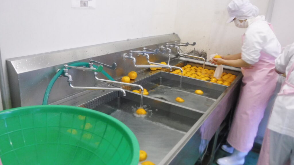 みかんは納品された後、ひとつずつ丁寧に洗っています。3槽のシンクで3回洗いです!
