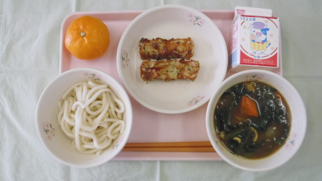 カレーうどん、牛乳、ちくわの磯辺揚げ、みかんです。