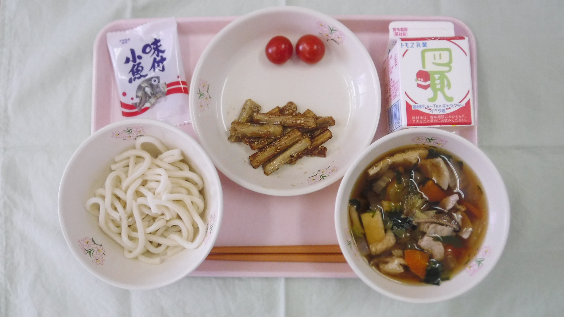 きのこと白菜のきつねうどん、牛乳、ごぼうの甘辛揚げ、ミニトマト、おさかなチップです。