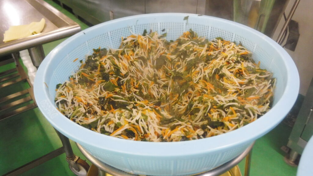 海藻サラダも520人分だとこの大きなざるが2つ分にもなります!カレーライスの日は温野菜サラダがつくことが多いですが、今日は海藻サラダです!