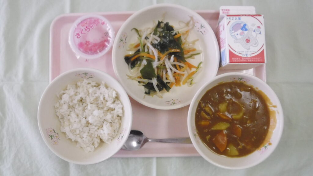カレーライス、牛乳、海藻サラダ、さくらゼリーです。