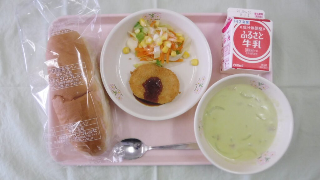 コッペパン、牛乳、グリーンポタージュ、ポテトコロッケ、キャベツのサラダです。