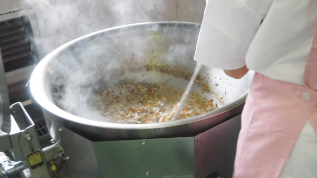 お肉はもも肉とロース肉の2種類を使い、しょうが、にんにく、と炒めてからにんじん、たまねぎ、にらを入れて炒めます。今日は2種類のお肉合わせて30㎏使用しました!仕上げにとうがらしも少し入るので、後味がピリッとして、ごはんのすすむ味付けです。ぜひ、ご家庭でも作ってみてください😊