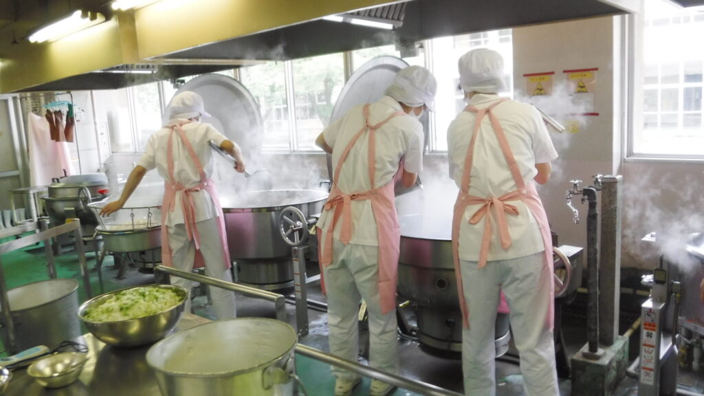 下の写真の左の調理員さんは下茹でした豆腐を引き上げています。