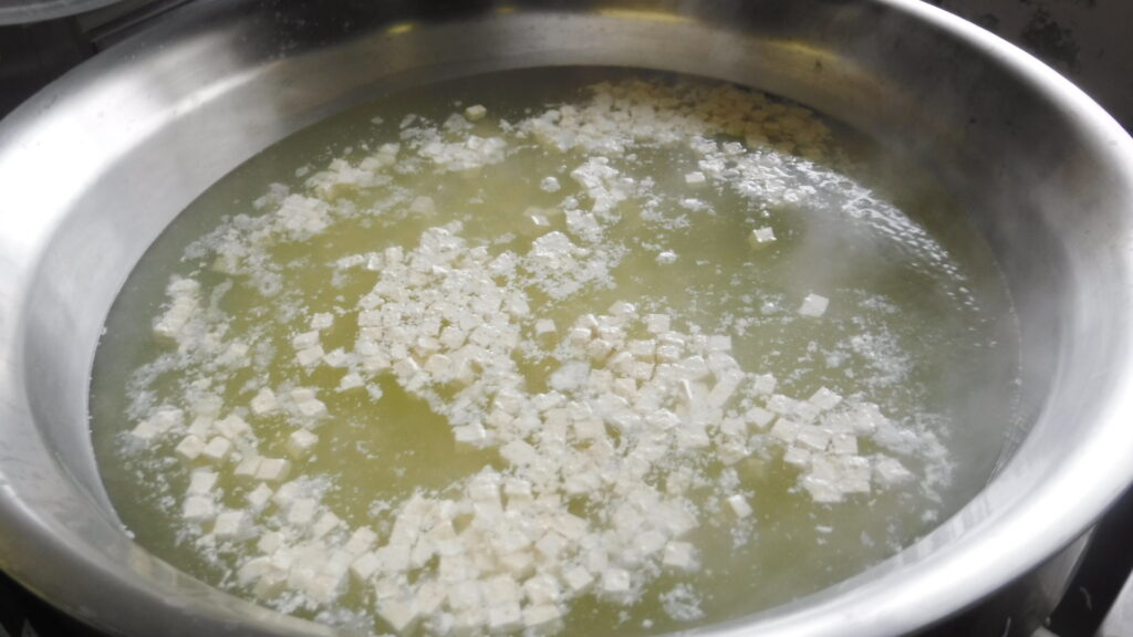 1度下茹でをしているからです!!全部で175丁もの豆腐をさいの目切りにし、しっかりと下茹でをします。