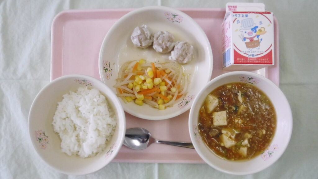 ごはん、牛乳、マーボー豆腐、しゅうまい、コーンサラダです。