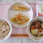 今日の給食は、 ごはん、牛乳、豚肉とキャベツのしょうが入りスープ、おかかきんぴら、りんごゼリー です。 今年度の給食のテーマは【丈夫な体をつくろう!】で、1学期のサブテーマは「減塩」です。 今日はその …