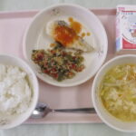 今日の給食は、 ごはん、牛乳、豚肉とキャベツのしょうが入りスープ、おかかきんぴら、りんごゼリー です。 今年度の給食のテーマは【丈夫な体をつくろう!】で、1学期のサブテーマは「減塩」です。 今日はその …