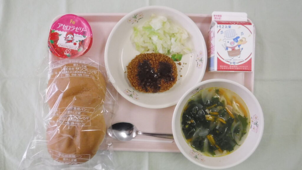 子供パン、牛乳、マカロニスープ、大豆とコーンのメンチカツ、ボイルキャベツ、アセロラゼリーです。