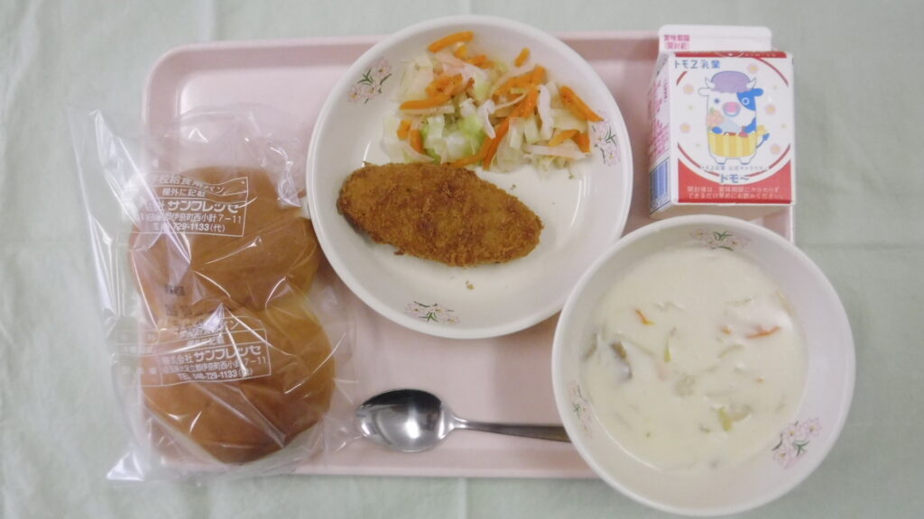 はちみつパン、牛乳、ニョッキのクリームスープ、コーンフライ、キャベツのサラダです。