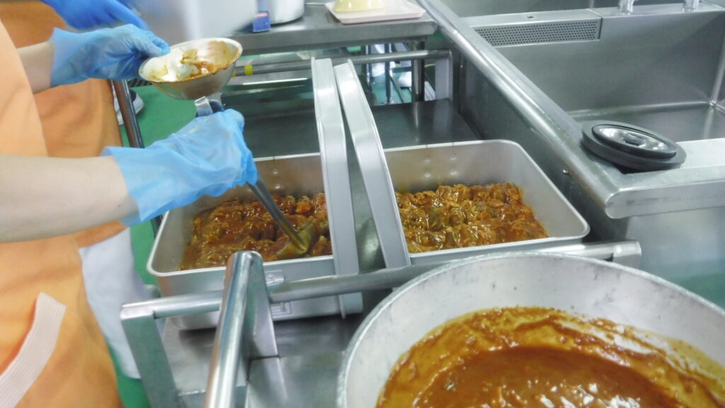 ソースは1クラス分ずつかけています。デミグラスソースは子どもたちからも人気でよく食べていました😆