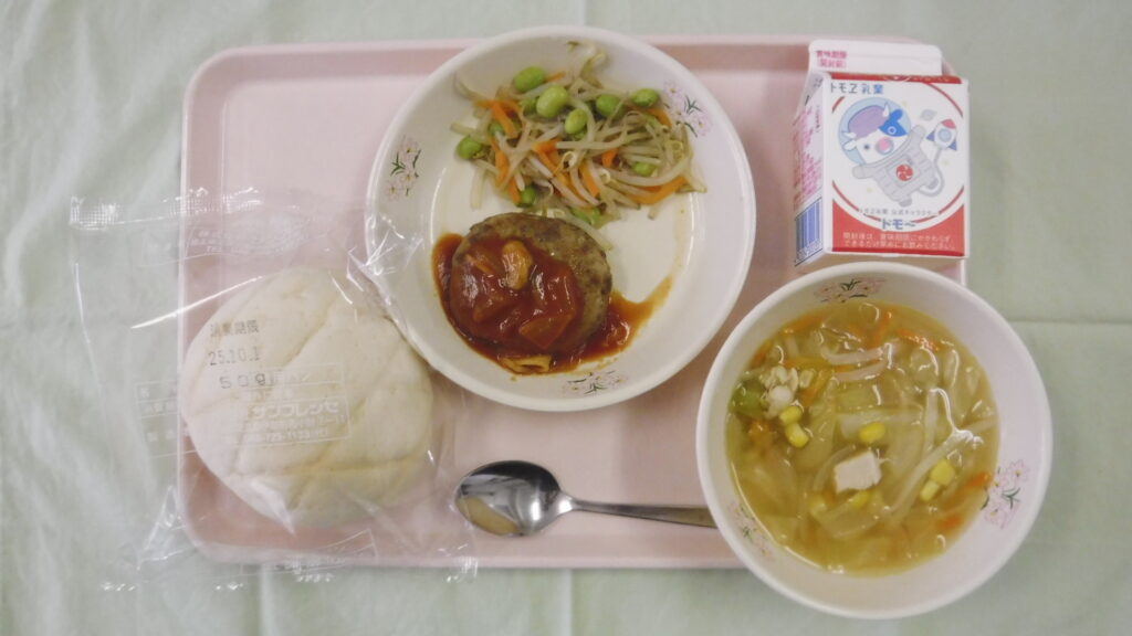 メロンパン、牛乳、ヌードルスープ、ハンバーグデミグラスソース、もやしのソテーです。