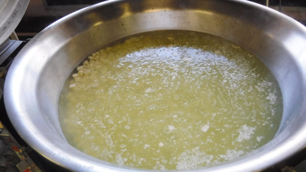 マーボー豆腐は久しぶりの登場です!! 具材を炒めて、味付けをして、煮て、とろみをつけて、下茹でをした豆腐を入れます。