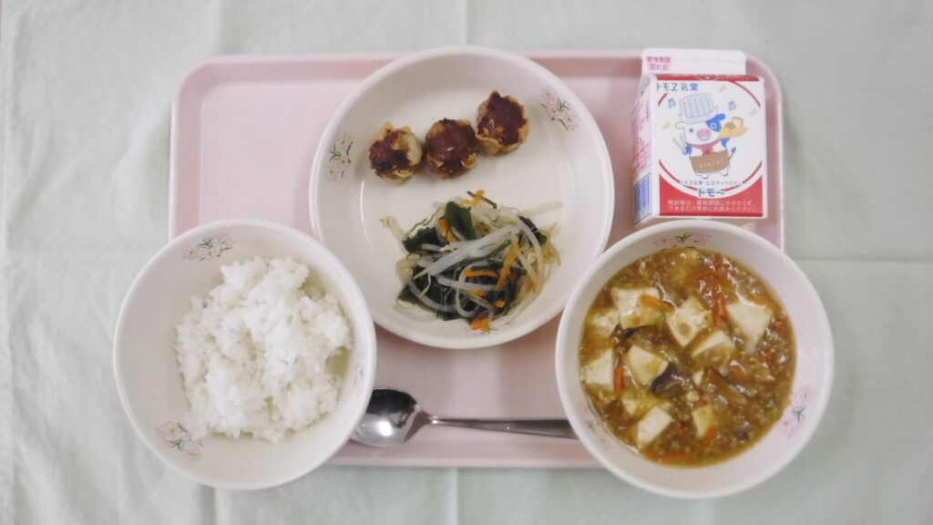 ごはん、牛乳、マーボー豆腐、しゅうまい、海藻サラダです。