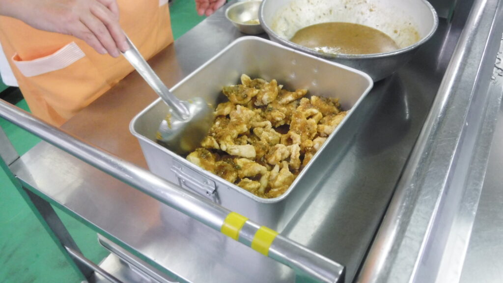 今日の給食は、 バターロール、牛乳、白身魚の香草フライ、野菜のクリームスープ、花野菜サラダ です。 クリームスープやシチューを作るときには、後から入れる牛乳の量が多いため、あらかじめ温めてから入れます …