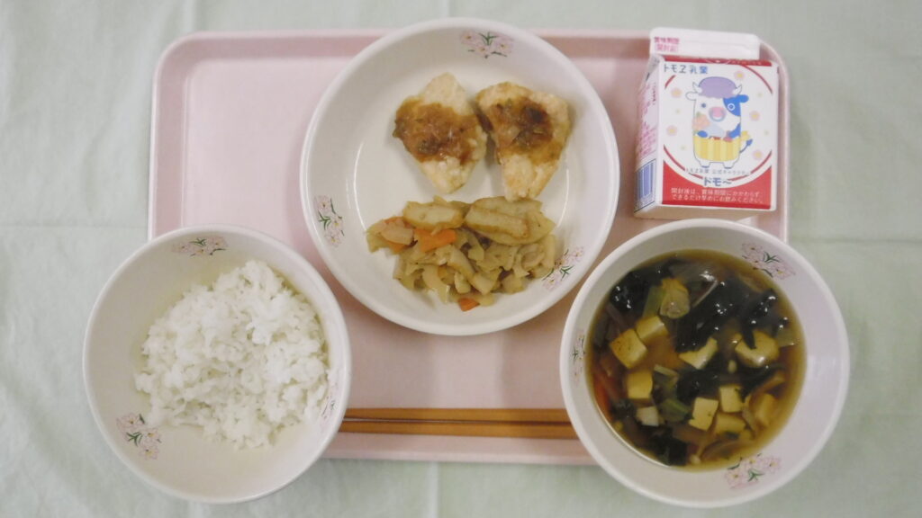 ごはん、牛乳、たっぷりきのこのあんかけスープ、鶏肉のねぎみそ揚げ、きんぴられんこんです。