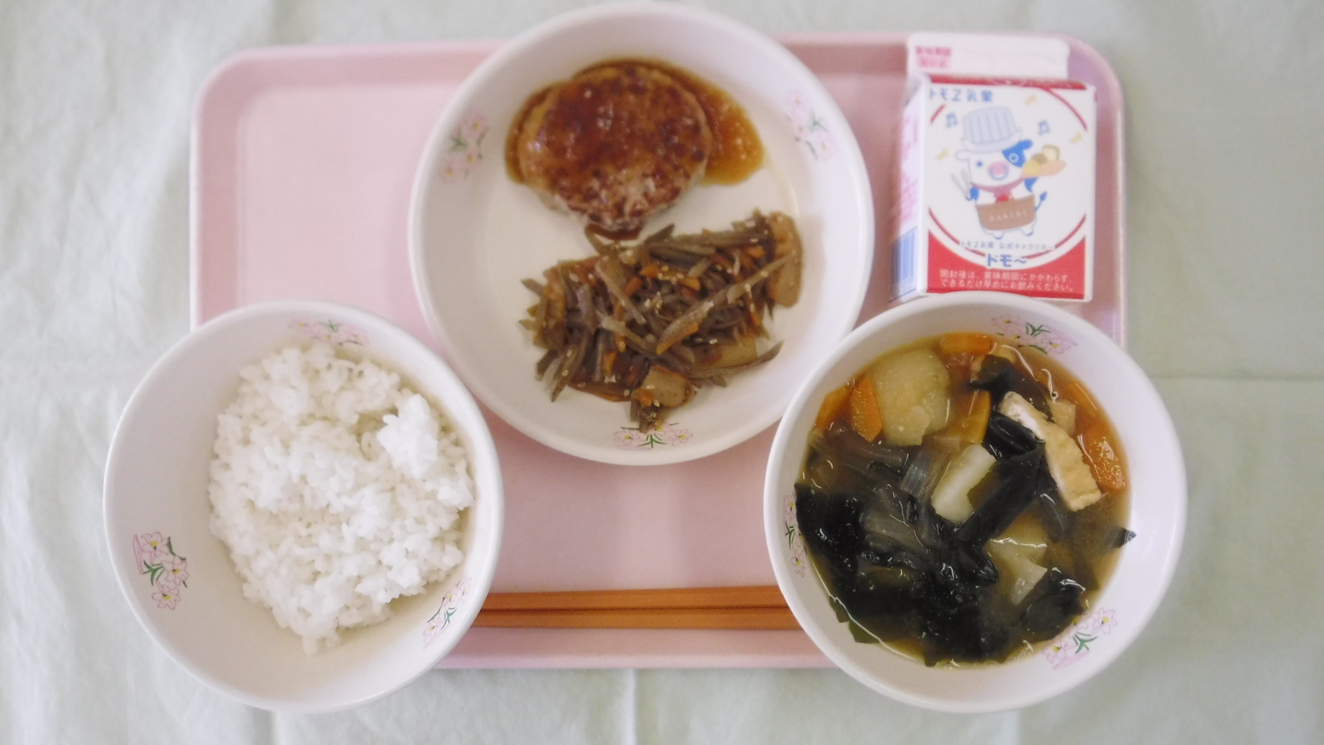 ごはん、牛乳、じゃがいもとわかめのみそ汁、和風おろしハンバーグ、きんぴらごぼうです。