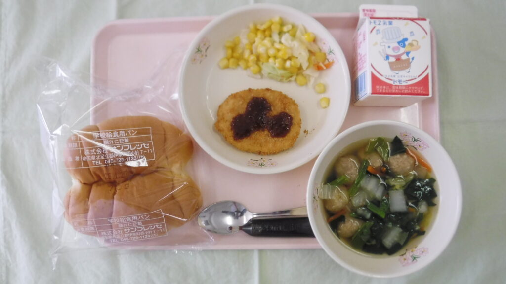 ロールパン、牛乳(コーヒー飲料)、白菜と肉団子のスープ、川口さといもコロッケ、コーンスローサラダです。