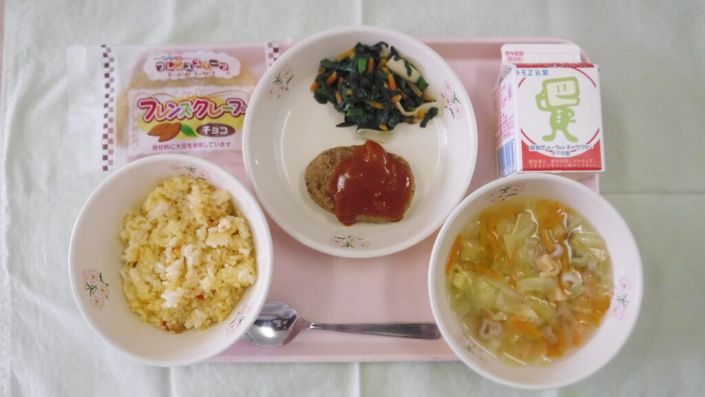 キャロットピラフ、牛乳、ハートのマカロニスープ、ハンバーグデミグラスソース、ほうれんそうときのこのソテー、米粉のチョコクレープです。