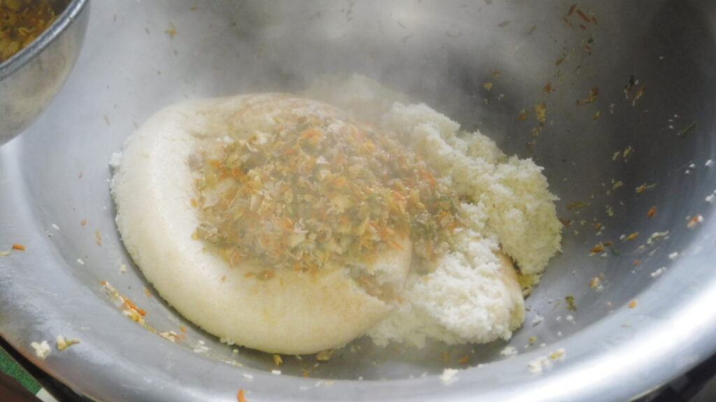 具をあらかじめ作り、炊けたごはんと混ぜ合わせました。