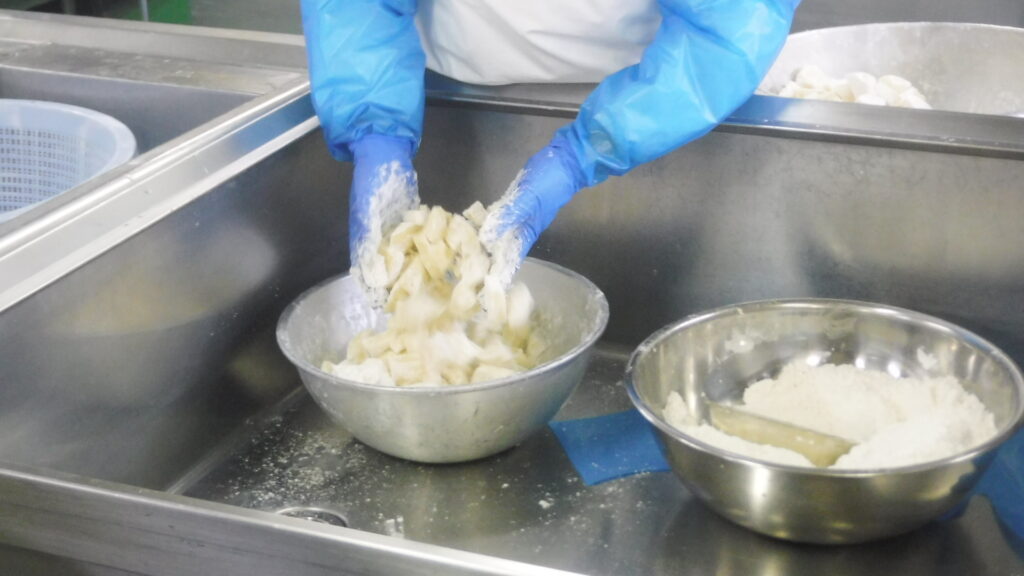 給食ではじゃがいもに小麦粉をつけて揚げています。