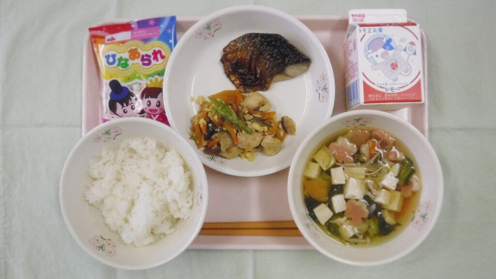 今日の給食 給食室から 3/3 今日の給食🎎 今日の給食は、 ひな寿司(酢めし)、牛乳、菜の花のすまし汁、さばの辛味焼き、ひなあられです。 今日はひなまつりにちなんだ献立でした。ひな寿司の具はセルフでごはんに混ぜて食べます! すまし汁には今が旬の菜の花とうめの形の麩が入り、華やかな見た目になりました。 明日は人気のわかめごはんの登場です! -今日の給食, 給食室から