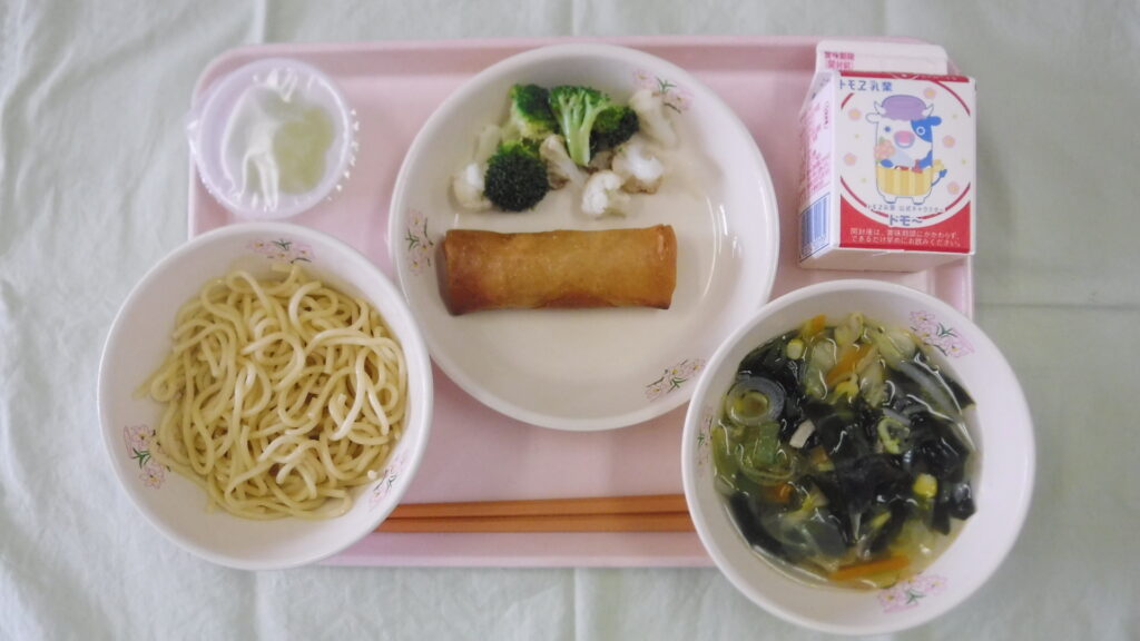 塩ラーメン、牛乳、春巻、花野菜サラダ、青りんごゼリーです。