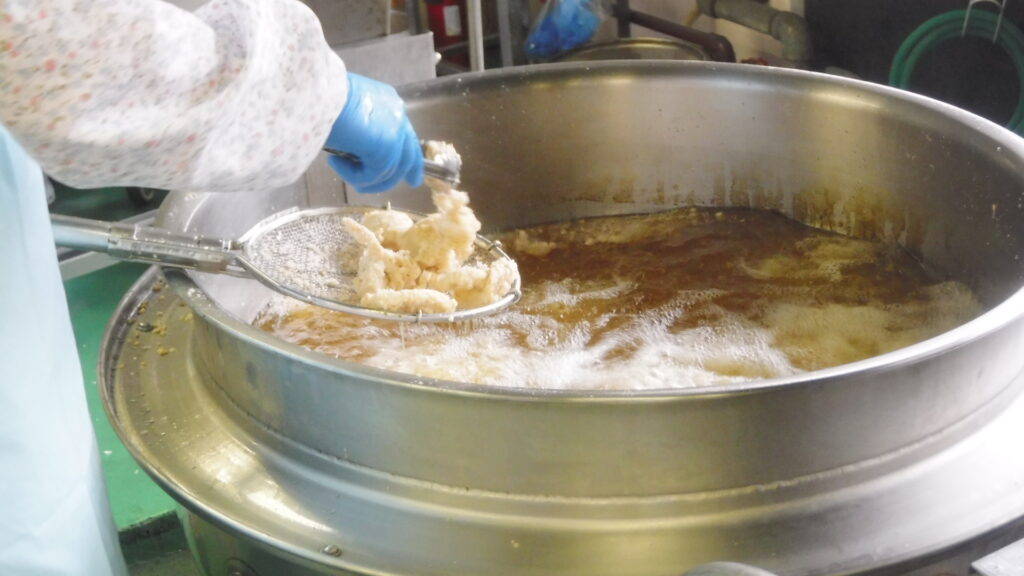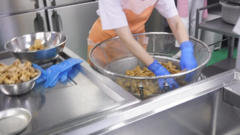 鶏のから揚げは、お肉が来たらすぐにしょうが、にんにく、砂糖、しょうゆで下味をつけて、でんぷんをまぶして揚げました♪