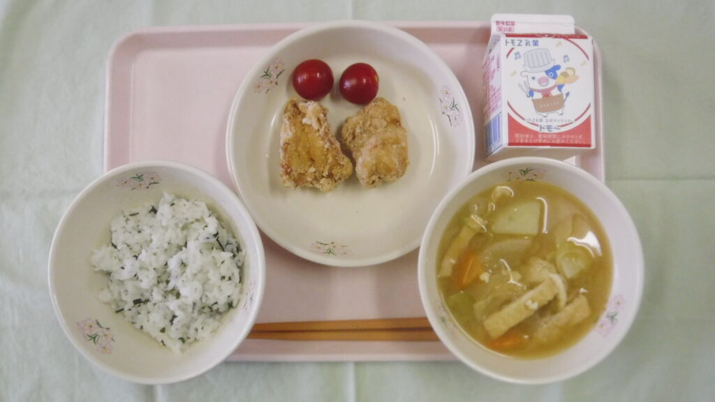 わかめごはん、牛乳、呉汁、鶏のから揚げ、ミニトマトです。