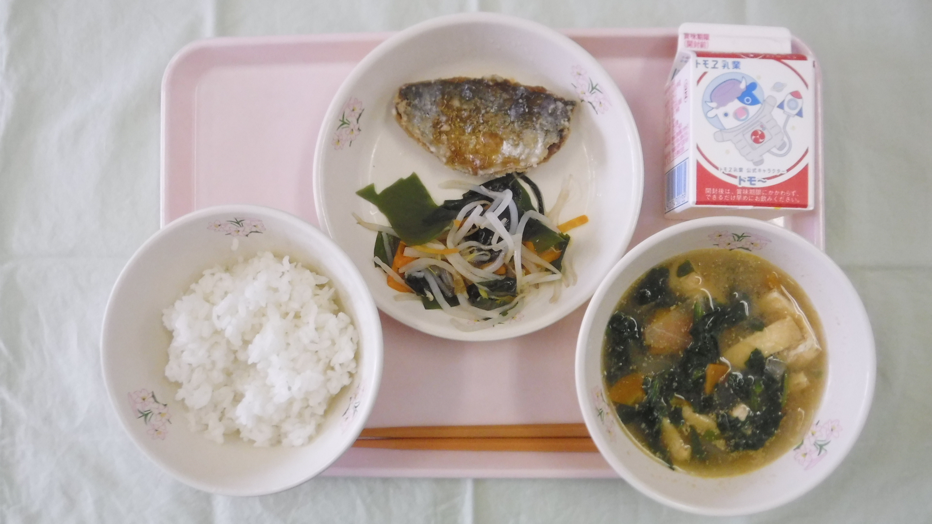 ごはん、牛乳、ピリ辛ごまみそ汁、あじの甘酢あんかけ、わかめのサラダです。