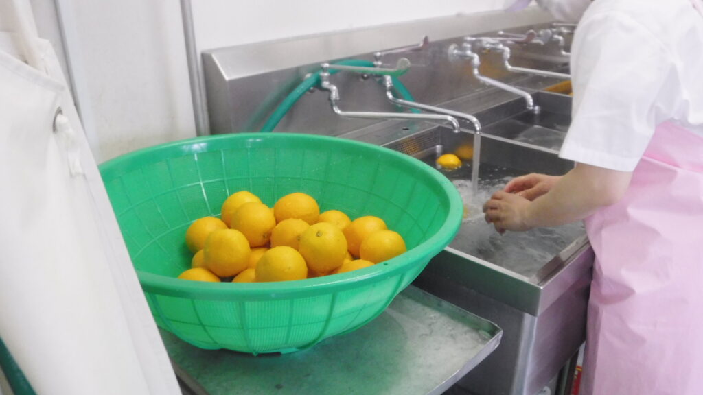 オレンジは、3槽シンクで丁寧に洗いカットしました。