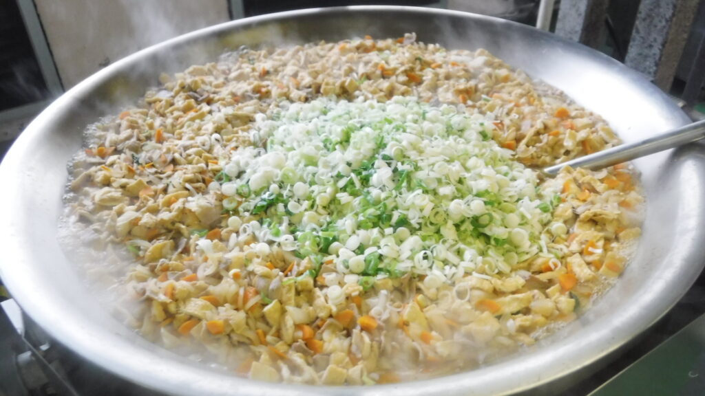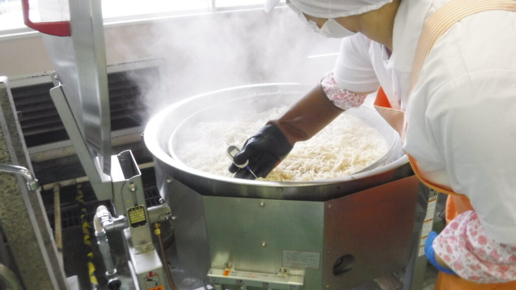自校調理中学校では、うどんも袋めんではなく、量配缶のうどんを使用しています。